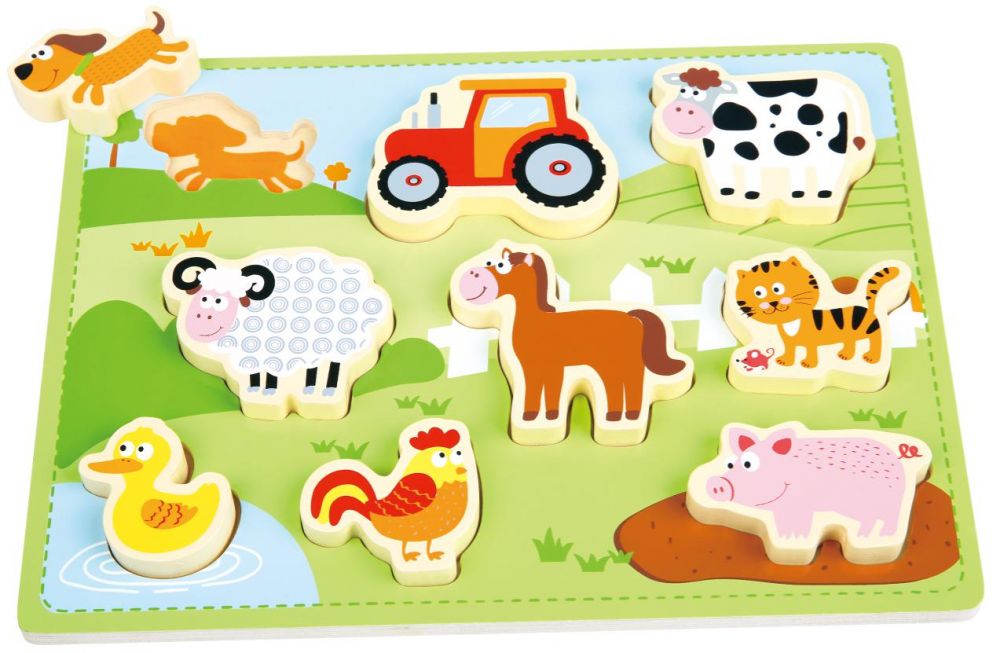 Układanka ta to doskonała zabawa dzięki, której Twoje dziecko może rozwijać swoje umiejętności manualne i poznawcze. Polega ona do dopasowywaniu elementów do pustych miejsc, przy jednoczesnym poznawaniu zwierzątek z farmy. W skład układanki wchodzą między innymi: krowa, koń, kaczka, itd., a także traktor.